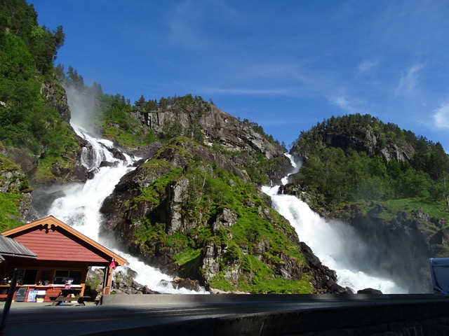 Kurz hinter Sauda wartet schon der Svardalsfossen auf uns. Die Luft am Wasserfall ist erfrischend und wir haben, nach dem Aufstieg, einen schönen Blick auf das tosend fallende Wasser und den unter uns liegenden Fjord. Ups, da hat es auch schon einen kleineren Ausrutscher wegen nasser Schuhe gegeben, aber nix passiert 🙂