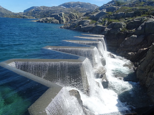 Kurz hinter Sauda wartet schon der Svardalsfossen auf uns. Die Luft am Wasserfall ist erfrischend und wir haben, nach dem Aufstieg, einen schönen Blick auf das tosend fallende Wasser und den unter uns liegenden Fjord. Ups, da hat es auch schon einen kleineren Ausrutscher wegen nasser Schuhe gegeben, aber nix passiert 🙂