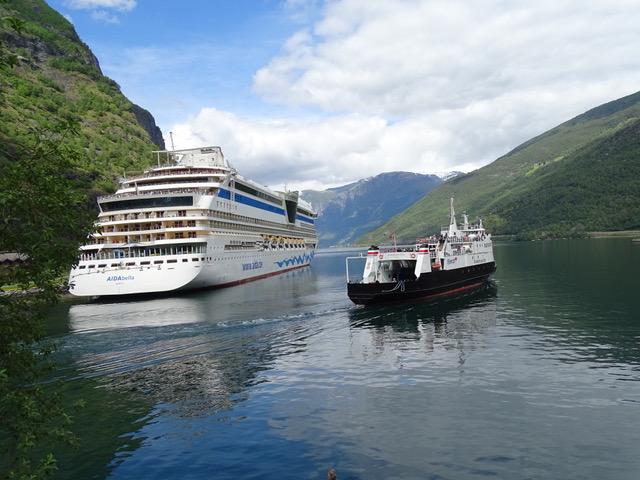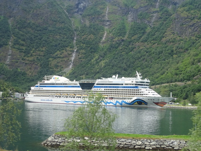 Wir fahren nach Flåm und steigen auf die Bahn um. Da die Züge gut ausgebucht sind haben wir bis zur Abfahrt fast 2 Stunden Zeit, können also noch ein paar Caches suchen und die AIDAbella im Hafen von Flåm begrüßen.
