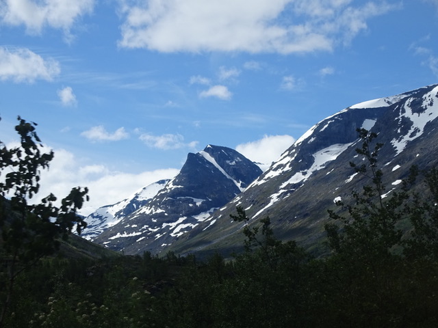 Jetzt fahren wir weiter auf dem Sognefjellet und schon beim ersten Stopp haben wir einen schönen Ausblick auf die Jotunheimer Berge. Je höher wir fahren, umso mehr Schnee liegt noch auf den Bergkuppen.