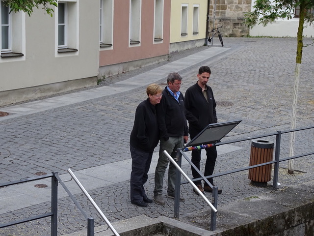 Als unser heutiges Ziel hat sich Amberg herausgestellt. So haben wir die Autobahn verlassen. Seltsam kommt uns der Temperaturabfall vor, nachdem wir die Autobahn verlassen haben. Auf der Autobahn hatten wir noch 24 °C, kurz vor Amberg waren es nur noch 11°C und Gewitterregen. Trotz des Regens haben wir uns am Amberger Congress Center niedergelassen. Nach einem kurzen Stadtbummel (juhu, wir haben uns endlich mit Infomaterial über unser grobes Ziel ausgestattet)