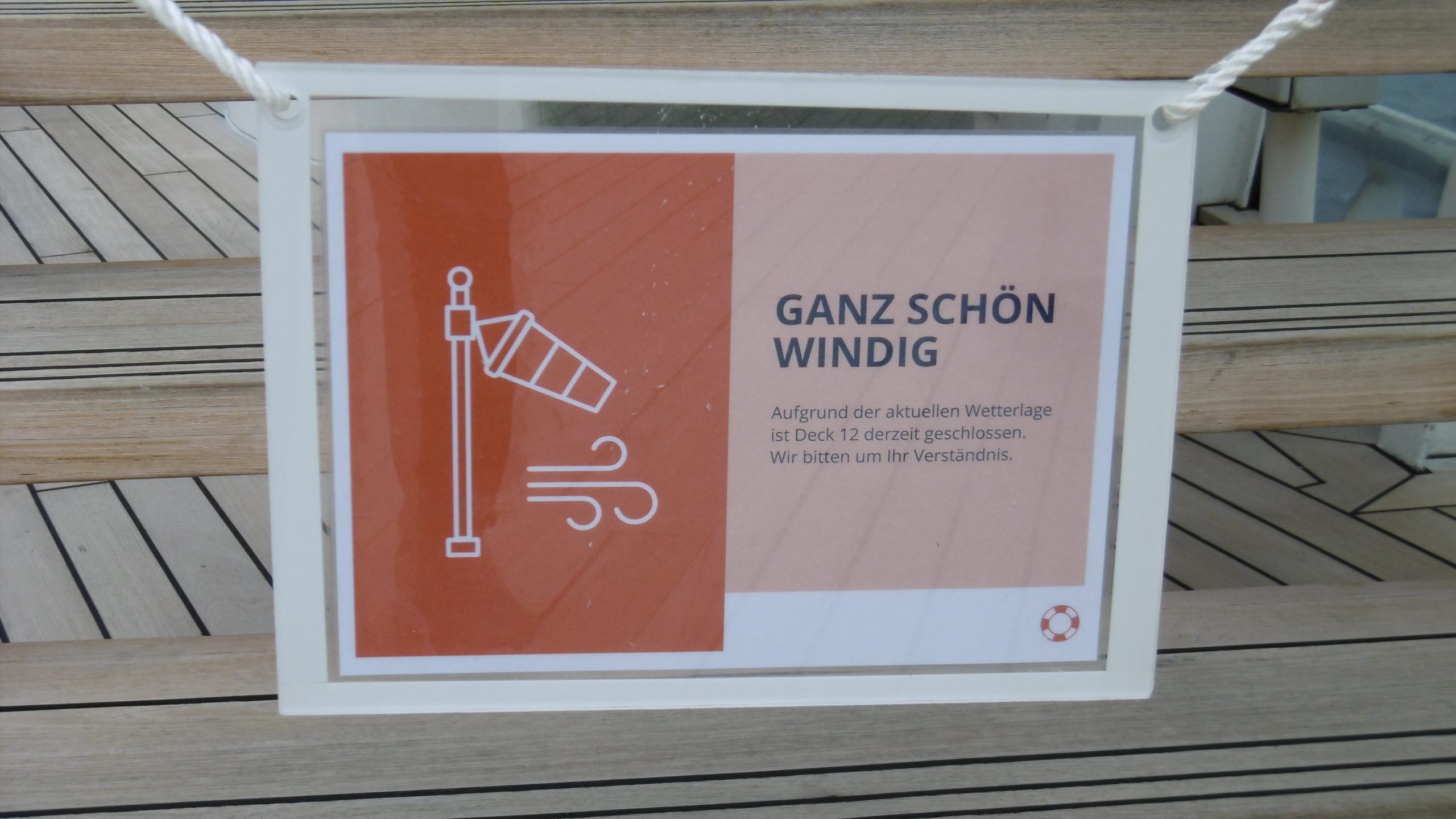Nach dem entspannten Frühstück versuchen wir einen Rundgang auf dem Schiffsdeck zu machen. Einige Bereiche sind mit dem Hinweis, dass es doch arg windig ist, abgesperrt und die Sonnenliegen gesichert. Auch das Wasser vom Pool wurde abgesenkt. Wir nutzen also Deck 5 für unseren Spaziergang und lassen uns den Wind um die Ohren wehen. Die Wellen haben sogar auf offener See leichte Schaumköpfe.
