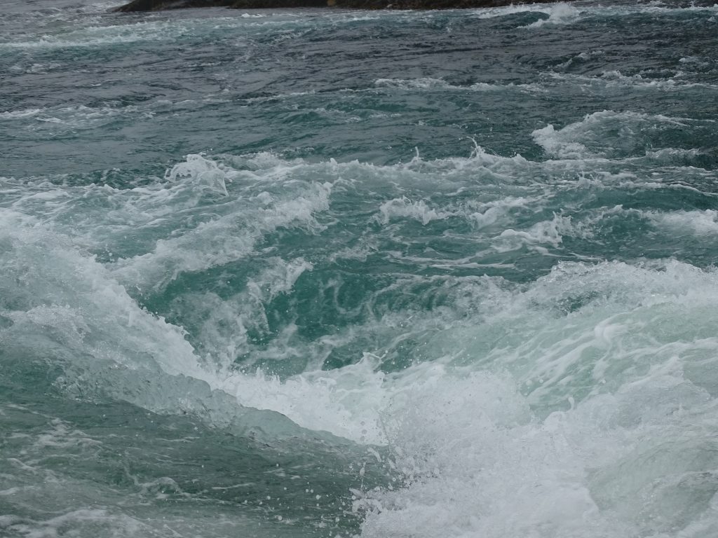 Dann geht es auf die Boote. Nachdem wir uns alle platziert haben geht es langsam los. Wir fahren ganz dicht an die Strudel heran und können direkt in den ein oder anderen Schlund sehen. Ganz schön tief. Da fühlt man sich in so einem Schlauchboot nicht unbedingt sicher. Unser Steuermann kennt sich aber aus und hält uns über Wasser. Es ist auch niemand aus dem Boot gefallen.