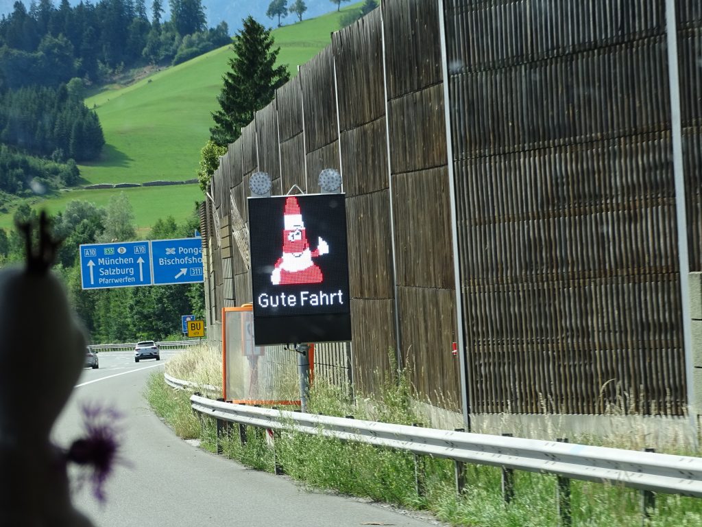 Weiter geht auf der Autobahn durch Kärnten. Und wir genießen die Natur rechts und links der Fahrbahn. Kurz vor dem Katschbergtunnel verlassen wir Kärnten und werden vom Salzburger Land begrüßt. Noch schnell eine Höhenkontroll-Brücke passiert und dann geht es in den Tunnel. Der Katschbergtunnel ist 5,9 km lang, wir fahren also eine Weile durch den Berg.