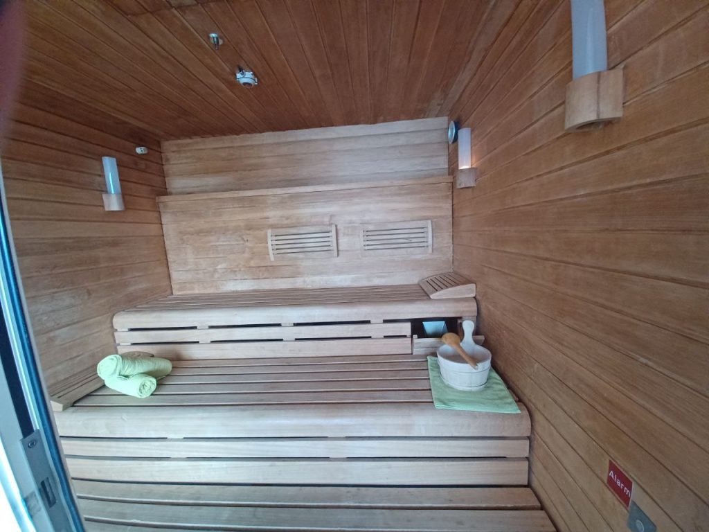 Wir schwitzen ganz privat in der Sauna und lassen uns im Whirlpool massieren. Dazu gibt es einen Prosecco und frisches Obst. So kann man auf jeden Fall entspannen. Um 19:00 Uhr heißt es dann leider Abschied nehmen. Dafür sind wir entspannt und sauber.