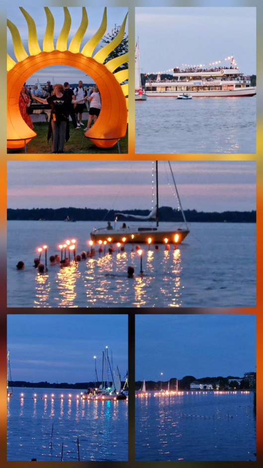 Hier ist schon einiges an Beleuchtung zu sehen. Natürlich gibt es auch zu essen und zu trinken aber wir sind ja satt. Also warten wir auf die Fackel-Schwimmer, das Highlight der Veranstaltung.