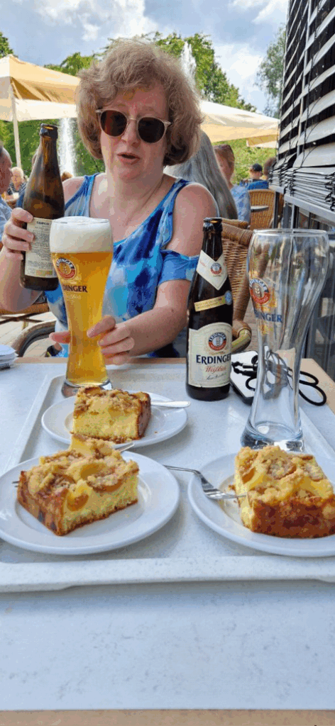 Also wieder runter und weiter geht es durch die Anlage. Am Café machen wir eine Pause und genießen ein Stückchen leckeren Aprikosenkuchen und ein kühles Weizenbier.