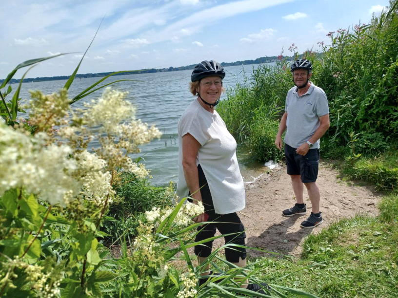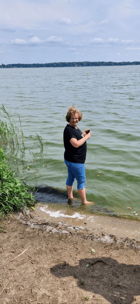 Die Tour ist sehr kurzweilig und hin und wieder gibt es auch mal einen Blick auf den See. Wir finden sogar eine ganz kleine Badestelle und Anne testet die Wassertemperatur.