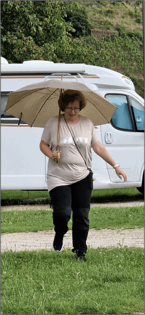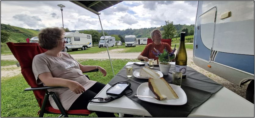 Das ist doch sehr nett. So kommt sie wenigstens nicht völlig nass bei uns an. Wir genießen unseren Kuchen mit einem leckeren Glas Moselwein.