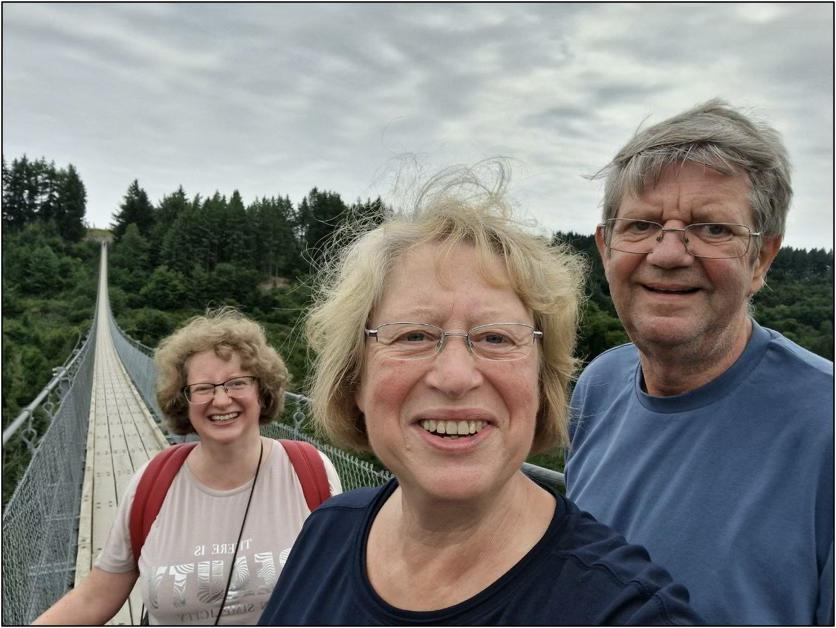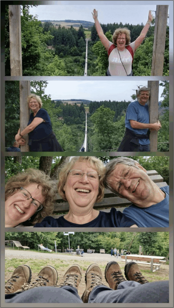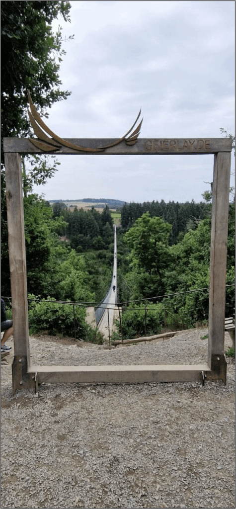 Als wir auf der anderen Talseite so sitzen merken wir, dass die Brücke sich immer mehr füllt. Ein guter Anlass den Rückweg anzutreten. Je mehr Menschen auf der Brücke sind um so besser die Schwingungen 😂 OMMM, schön Einatmen und Ausatmen. Einige Schrauben waren auch fest.