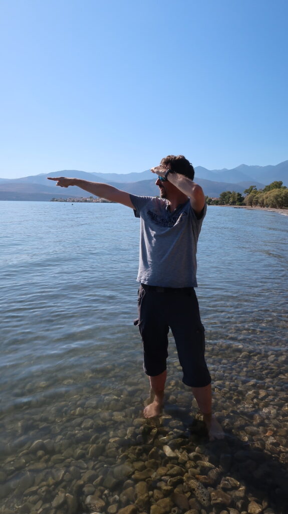Nach diesem Ausflug sind wir auf dem „kurzen“ Weg nur 30 Minuten von Delphi entfernt. Das ist ja viel zu kurz :D. Also legen wir die Route etwas um und fahren noch etwas durch die Gegend. Aus den Bergen sind wir ganz schnell am Wasser, dann in den Bergen und wieder am Wasser. Der Ausblick ist einfach fantastisch. Als wir das letzte Mal am Golf von Korinth sind halten wir an und baden das erste mal unser Füße. Das Wasser ist hier sehr schön warm und erfrischt doch.
