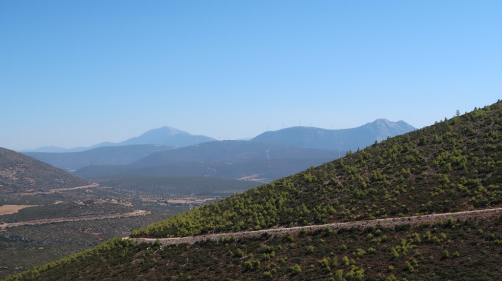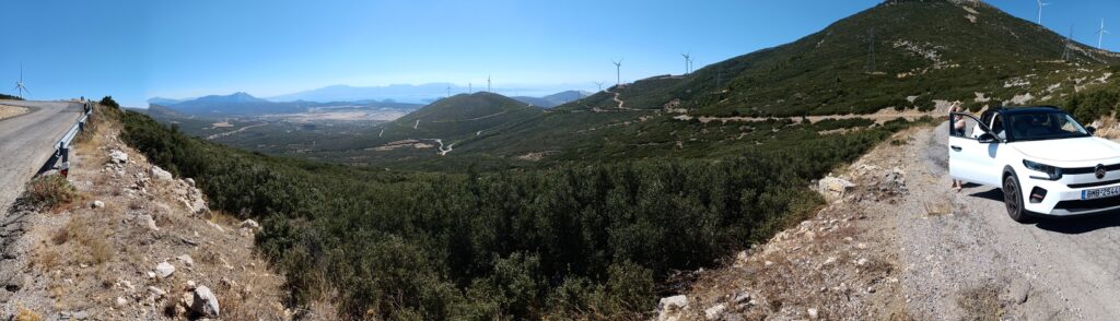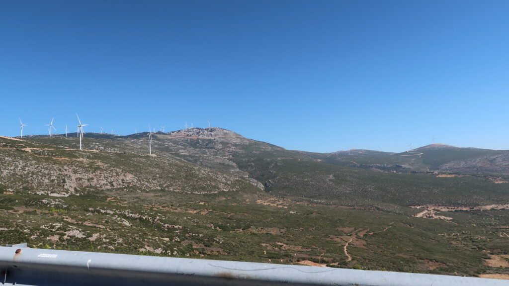 So geht es durch den Athener Stadtverkehr auswärts Richtung Delphi. Das Navi haben wir so eingestellt, dass wir Autobahnen, Mautstraßen und sicherheitshalber auch Fähren meiden. Nach Athen kommen wir durch nicht so ansehnliche Gewerbegebiete. Ähnliches haben wir im Bereich um Verona aber auch beobachtet. Als diese dann so langsam nachlassen, lässt auch schlagartig der Verkehr nach. Wir schlängeln uns durch die Berge nach Nordwesten.