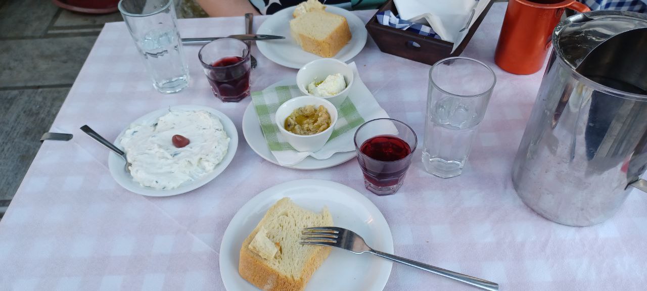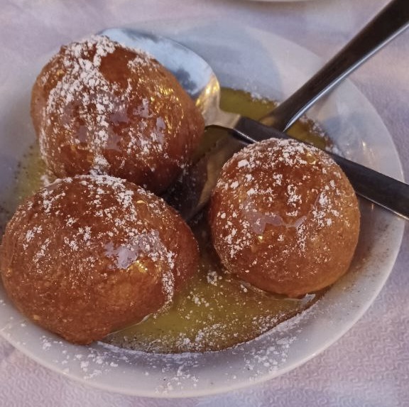 Unerwarteterweise gab es einen Nachtisch von der Taverne. Ein Teller mit 3 großen Kugeln und einer Soße dazu. Die Kugeln entpuppen sich schnell als Quarkbällchen und die Soße als Honig. Ein himmlischer Geschmack, egal dass wir eigentlich schon satt sind.