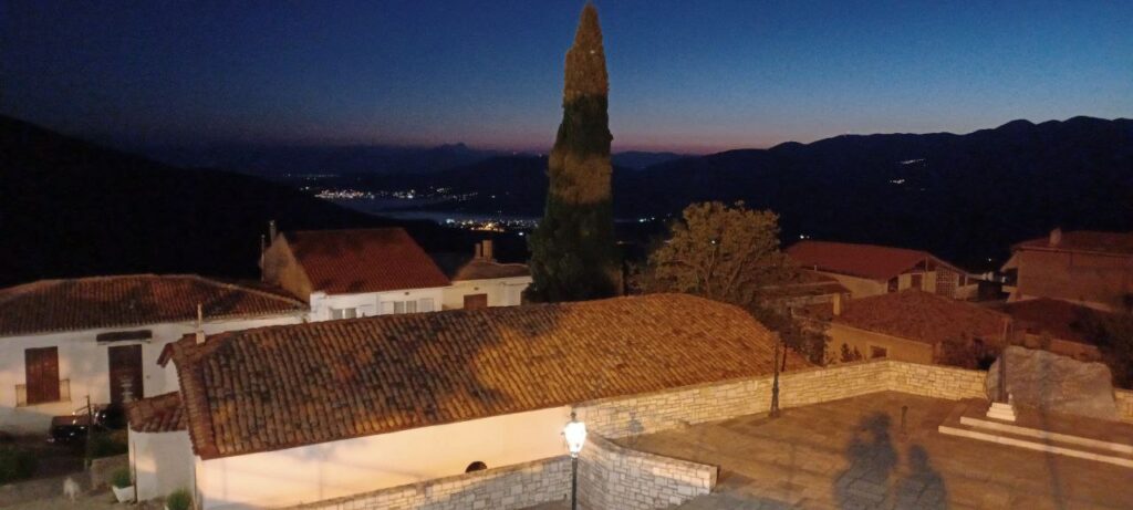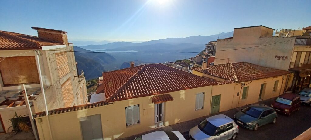 Bei Kirra verlassen wir das Wasser und fahren durch ein breites, voll mit Olivenbäumen gesäumtes Tal. Hoch oben am Hang schlängeln sich einige Dörfer, die unsere Aufmerksamkeit erregen. Je näher wir kommen, desto klarer wird es. Das Dorf ganz oben ist Delphi. Im Ort angekommen fahren wir erstmal zum Hotel und dran vorbei. Da es hier nur Einbahnstraßen gibt, suchen wir die Einmündung zur Rückstrecke. Diese verläuft ca. 20 Meter höher in die entgegengesetzte Richtung. Neue Runde, neues Glück. Da wir jetzt wissen, wo das Hotel ist, finden wir vorher einen Parkplatz für unser Auto. Im Hotel ist wieder alles gut vorbereitet und der Check-In schnell erledigt. Der Ausblick aus unserem Zimmer ist einfach toll. Wir können durch das ganze Tal bis zum Golf von Korinth schauen.