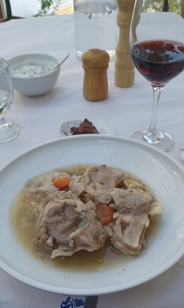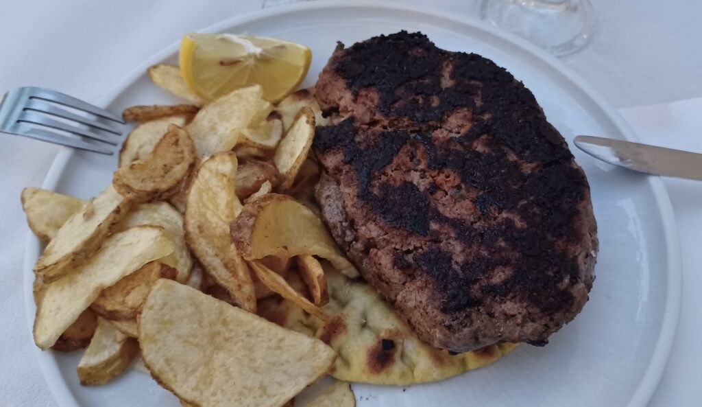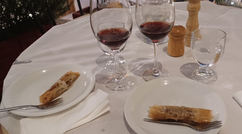 Gegen 19:00 Uhr machen wir uns dann wieder auf, um der nahe gelegenen Taverne Vakhos einen Besuch abzustatten. Heute gibt es zu den üblichen Beilagen (ihr wisst ja: Tzaziki und Rotwein) zum einen Bifteki und Lamm in Zitronensoße. Mmmmhh. Zum Abschluss gibt es eine Rolle Baklava von der Taverne.
