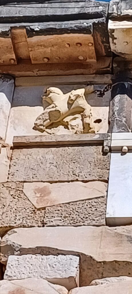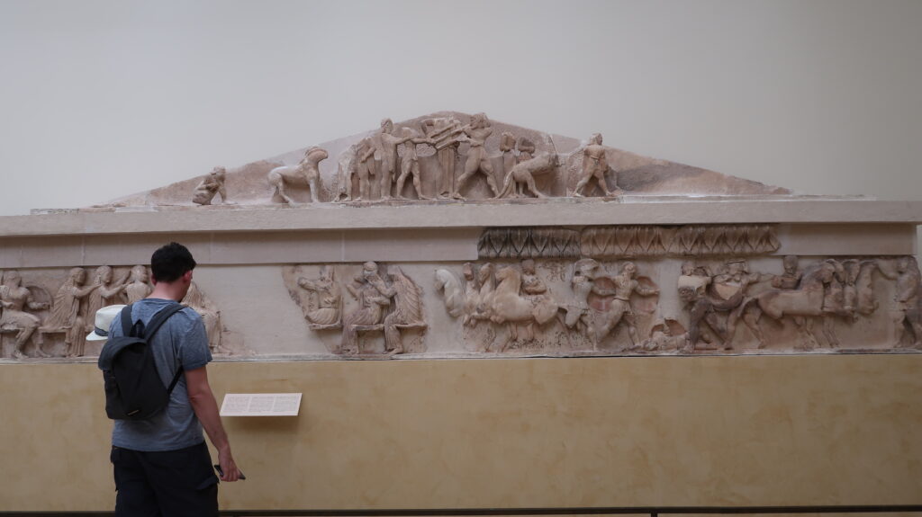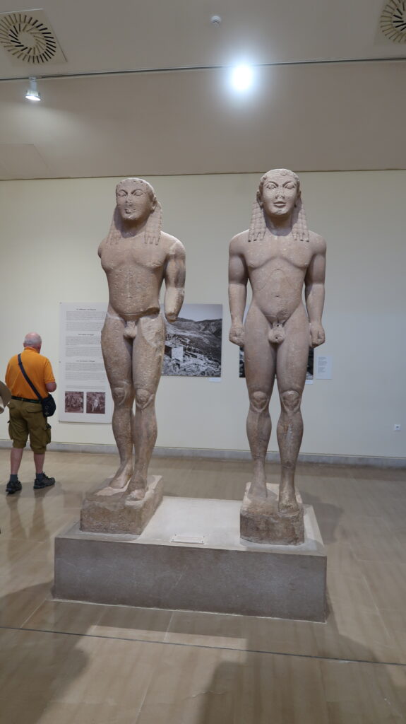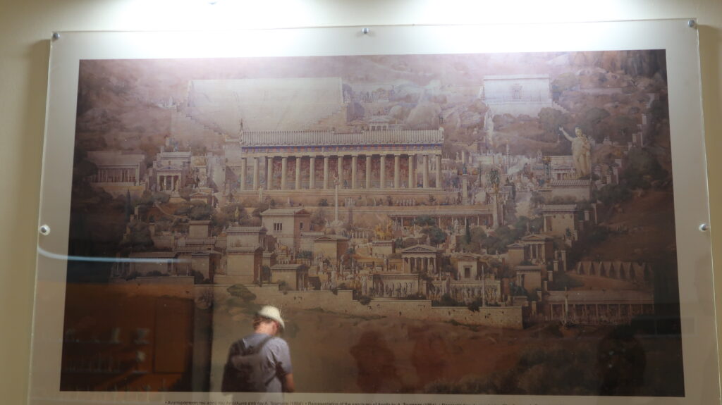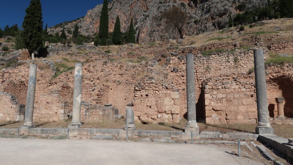 Auf dem Gelände der Turnhalle (Αρχαίο Γυμνάσιο Δελφών/Ancient Gymnasium of Delphi) sehen wir Leute durch die Gegend laufen. Der Eingangsbereich sieht ziemlich verlassen und verfallen aus. Kurz danach stellen wir fest, dass das eigentliche Gelänge verschlossen ist. Bei den Personen handelt es sich um Archäologen, die liebevoll Steine sortieren. Diese Maßnahme soll noch bis 2027 dauern. So lange können wir leider nicht warten.