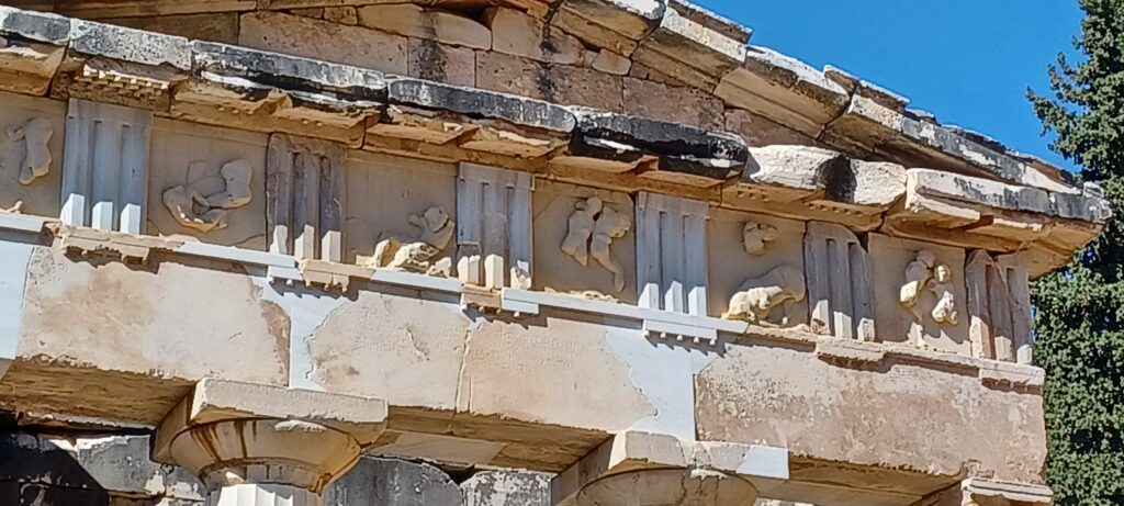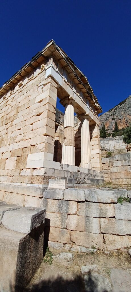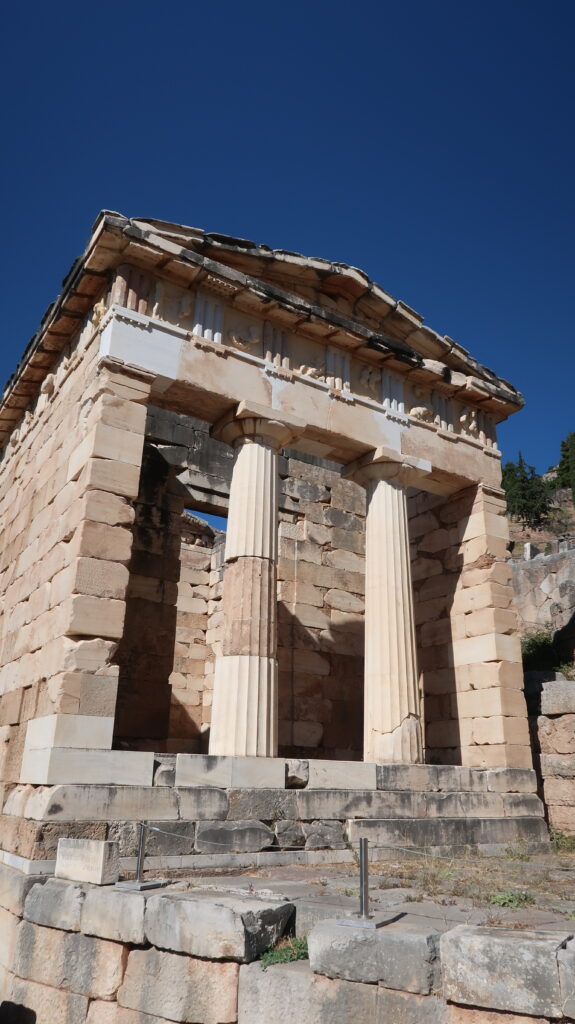 Das Schatzhaus der Athener (Θησαυρός των Αθηναίων) ist schon ein erstes Highlight, da dieser Kleintempel, der als Aufbewahrungsort von Weihgeschenken diente, sehr gut erhalten ist.