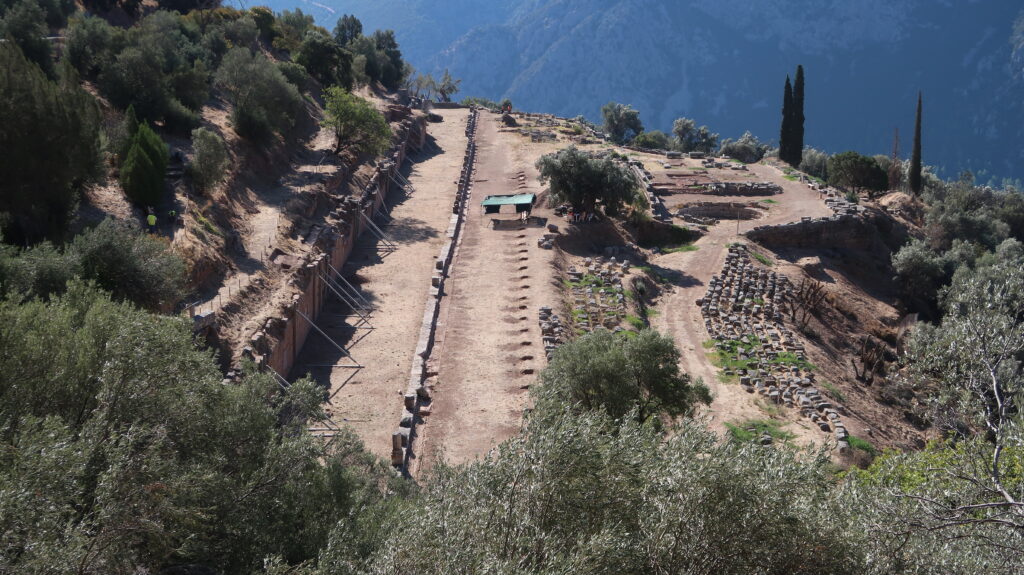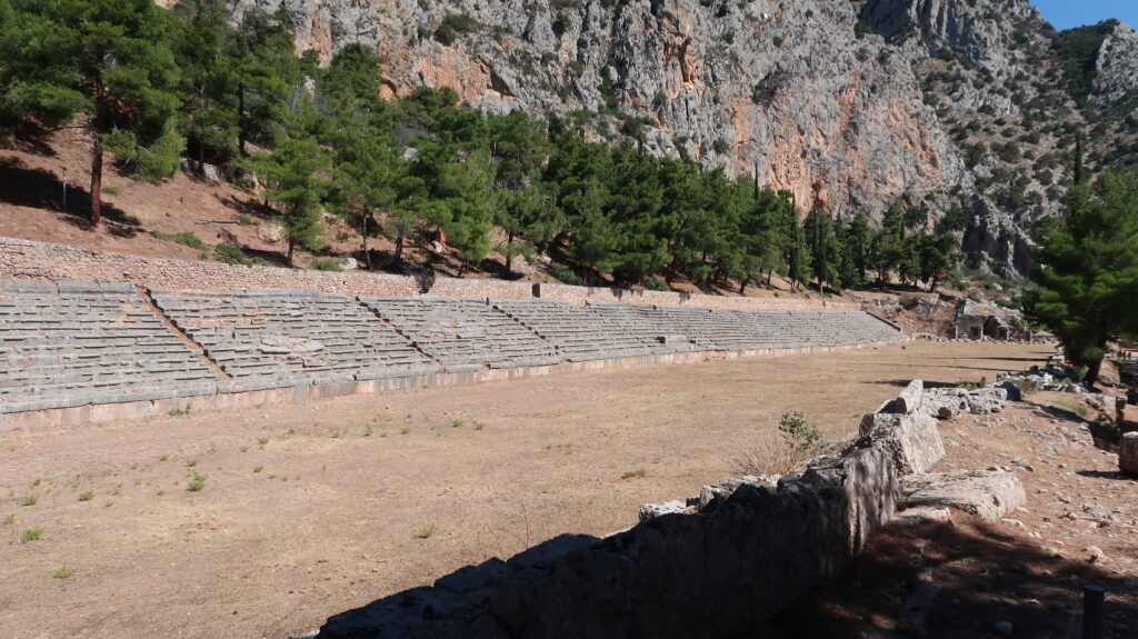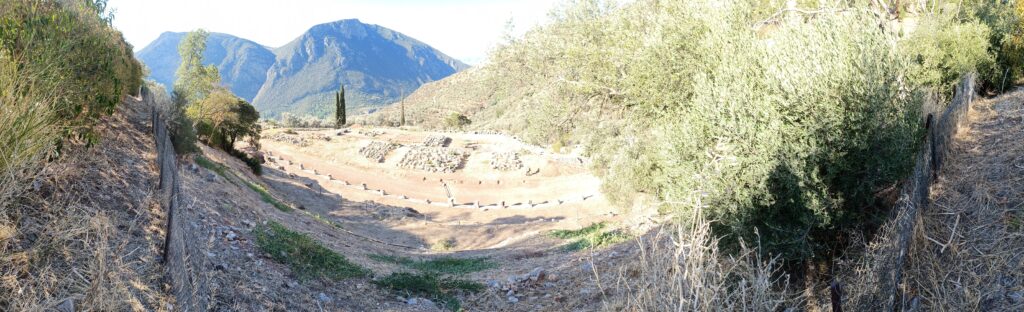 Weiter nach oben geht es aber weiterhin. Am Ende des Aufstiegs finden wir noch das antike Stadion von Delphi (Αρχαίο Στάδιο Δελφών) Wir fragen uns zwar, wie hier noch Sport gemacht werden kann, wir sind schon vom Aufstieg völlig fertig, reden uns dann aber damit raus, das in der Antike noch nicht so viel vor dem Computer gearbeitet wurde 😉