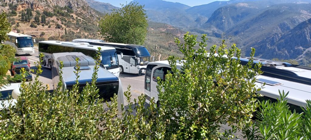 Nachdem wir den Apollontempel wieder erreicht haben, geht es auf einmal nicht mehr weiter. Der Weg wird uns von Mengen von Reisegruppen, die jetzt bergauf wollen versperrt. Teilweise warten wir ab, teilweise bleiben wir auch im Weg stehen, um uns langsam aber sicher weiter nach unten zu bewegen. Wo kommen die denn jetzt alle her? Als wir dann auch noch unsere Reiseleiterin von vorgestern mit einer Gruppe sehen, wird es uns klar. 9:00 Uhr Abfahrt in Athen, 12:00 Uhr Besichtigung Delphi 🙂 Nicht zu verachten ist das Busballett, das jetzt den Großteil des Parkplatzes und der Straße einnimmt. Das ist ganz großes Kino 😀