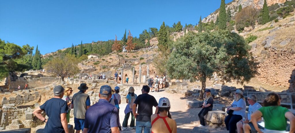 Na gut, dann gehen wir halt wieder zur archäologischen Stätte von Delphi (Αρχαιολογικός Χώρος Δελφών/Delphi Archaeological Site). Am Museum ergattern wir unsere Eintrittskarten und schon geht es aufs Gelände. Hier sind schon einige Reisegruppen unterwegs, diese sind aber zum Glück immer schneller als wir. So haben wir doch häufig Zeit ein bisschen im Schatten zur warten und dann in Ruhe alles anzuschauen.