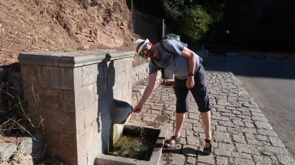 Immer wenn wir den Schatten verlassen, merken wir, dass die Sonne hier schon ziemlich kräftig ist. Unser erstes Ziel liegt etwas abseits vom Apollontempel. Die Straße ein Stück runter wollen wir erst zur antiken Turnhalle und dann zum Tholos von Delphi. Vorher geht es an der Kastilischen Quelle vorbei. Das Wasser ist erfrischend und lecker, nur der Hinweis für unseren Labcache ist durch Bauarbeiten ordentlich verpackt. Nun gut.