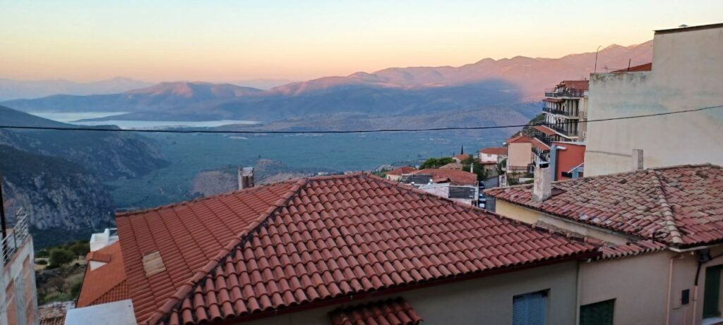 Geschafft und Glücklich verdrücken wir uns auf den Balkon und genießen von dort aus das abendliche Treiben in Delphi.