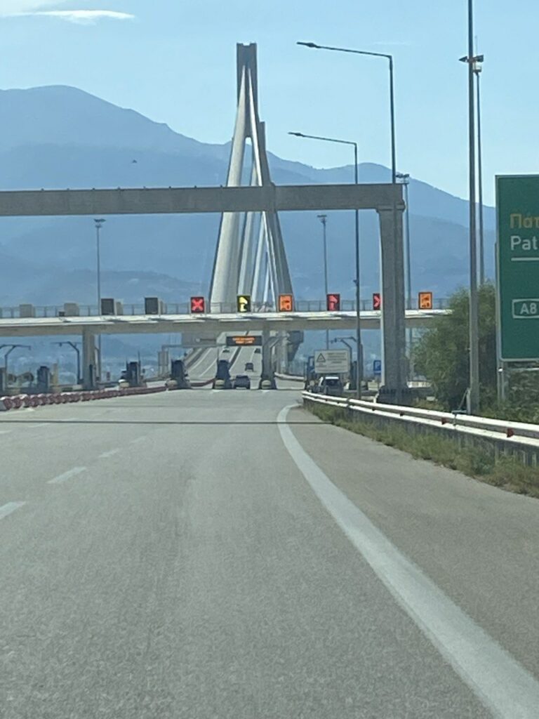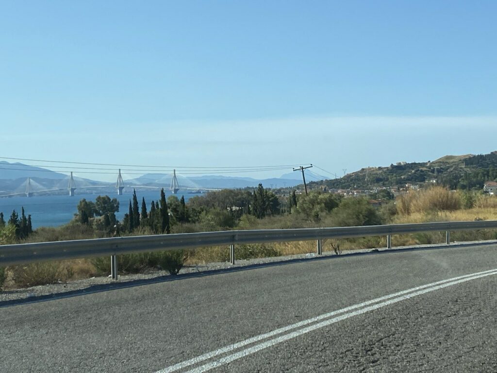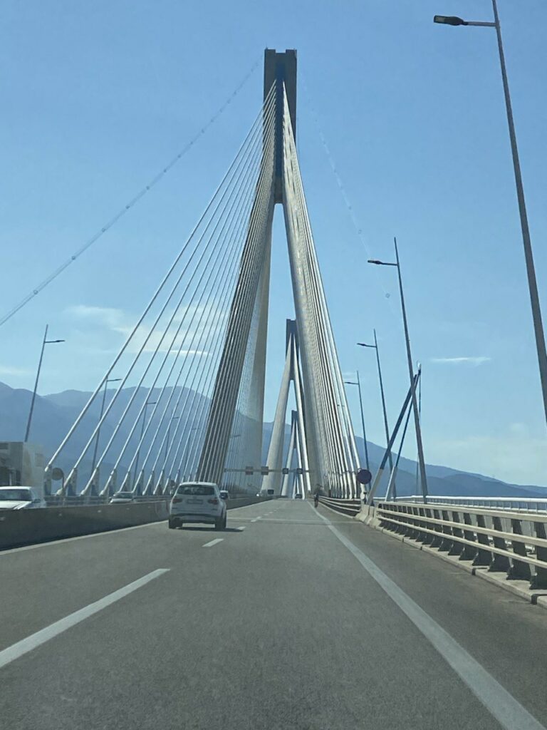 Kurz vor Patra überqueren wir den Golf von Patra über die Charilaos-Trikoupis-Brücke. Diese beeindruckende Brücke ist Mautpflichtig und verbindet das Festland mit dem Peleponnes. Jetzt sind wir also drauf.