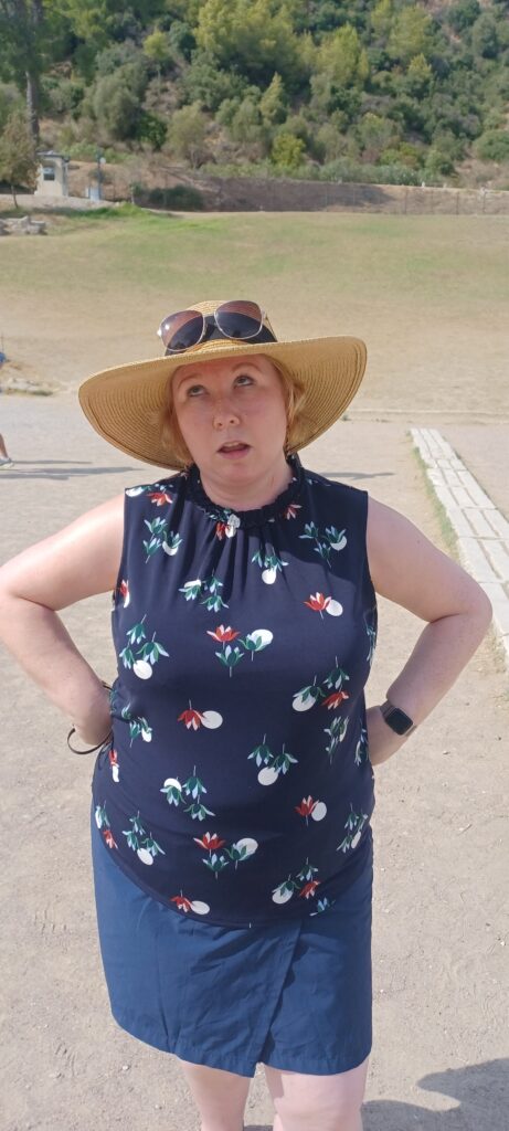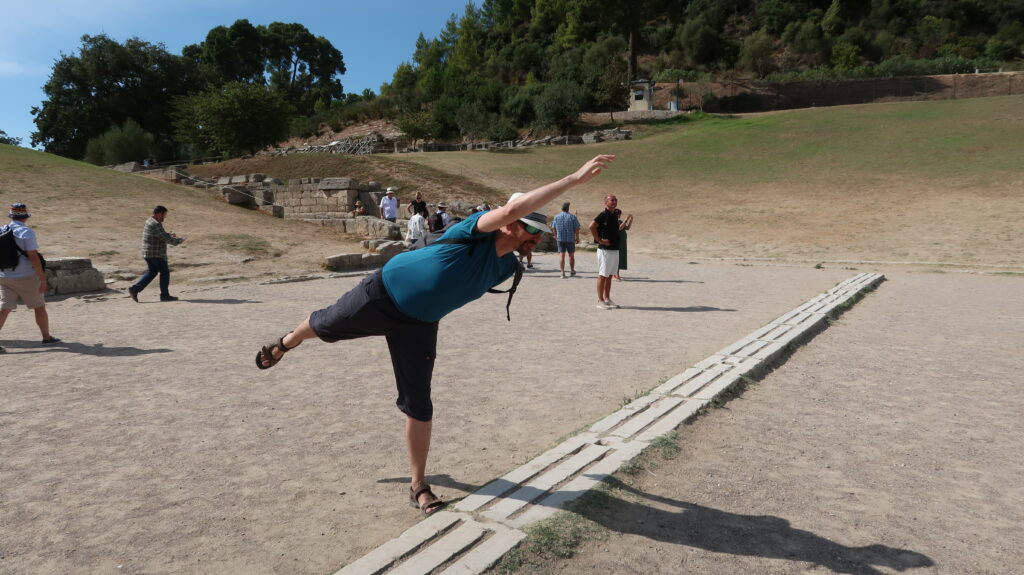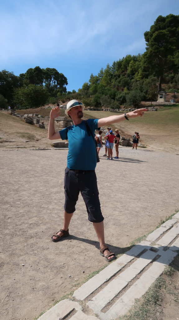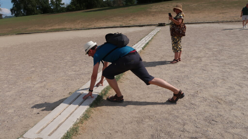 Gleich dahinter befindet sich erst das Museum und dann die Ausgrabungsstätte. Diese betreten wir nach dem Erwerb der Eintrittskarten auch gleich. Zu unserer Freude scheint zum einen die Sonne nicht ganz so doll (es sind ein paar Wolken am Himmel zu sehen) und zum anderen sieht das Gelände relativ flach aus. Die nächste Überraschung lauert auf den Beschreibungstafeln. Diese sind nämlich nicht nur in Griechisch und Englisch verfasst, sondern auch in Deutsch. Wir schlendern über dieses unglaublich große Gelände und schauen uns mehr oder weniger unordentlich sortierte Steine an :D. Wie in Delphi schon, können wir uns anhand der Beschreibungen sehr gut vorstellen, wie die Gebäude zusammengesetzt aussahen. Über Ancient Gymnasium, Phillipeion, Leonidaion und Zeustempel bewegen wir uns dem antiken Stadion zu. Dieses kann betreten werden und die Startblöcke sind natürlich die Markanten Punkte. Wir haben unseren Spaß.