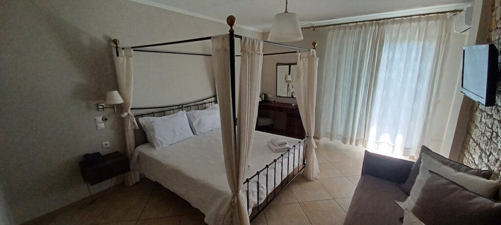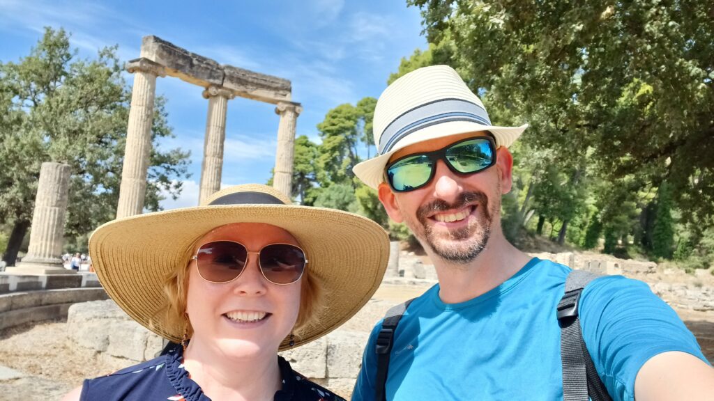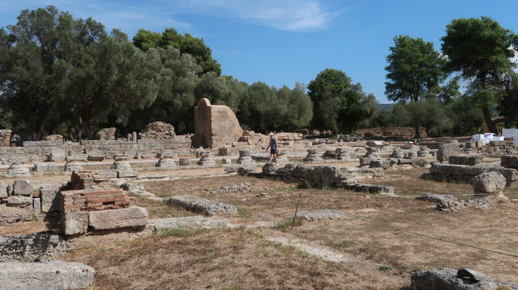 Nachdem wir Patra über viele Nebenstraßen (vielleicht waren es auch enge Wohngebietsstraßen) wird die Straße wieder gut und schlängelt sich über sanfte Berge gen Süden. Mal ist die Straße etwas gerader, mal etwas kurviger. Nach gesamt fast 4 Stunden (ja, eine Ausfahrt habe ich nicht gefunden und das Navi hat schneller eine neue Route berechnet, als ich wenden konnte) erreichen wir Olympia und unser Hotel das Olympic Village. Hier geht der Check-In erstaunlich schnell, da wir weder einen Anmeldezettel noch die örtiche „Kurabgabe“ zahlen müssen. Das war bisher anders. Hier reicht die Vorlage der Reservierung und schon haben wir unseren Schlüssel in der Hand. Das Zimmer ist ein Traum. Es ist fast schade, dass wir hier nur eine Nacht bleiben.