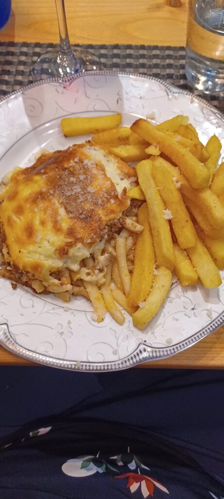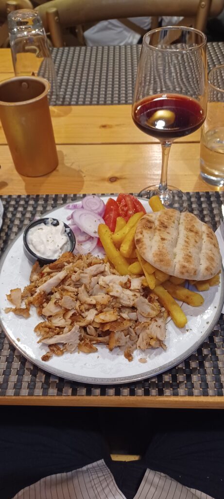 Gegen 19:00 Uhr meldet sich dann das kleine Hüngerchen. Wir wollen uns nochmal aufmachen und in der Stadt (eher im Dorf, so groß ist Olympia nun auch wieder nicht) was zu Essen suchen. Es ist für uns sogar nötig, dass wir den Regenschirm aufspannen. Es landen in Summe ungefähr 20 Tropfen auf dem Boden. Die beiden nahegelegenen Lokalitäten sagen uns nicht zu. So landen wir beim Pheidias Grill House. Im vorderen Bereich sitzt eine Gruppe lauter Jugendlicher, die wir leider auch noch verstehen. Es ist durch die 6 Jungs und 3 Mädchen unglaublich laut. Warum Karlo nicht am Tisch sitzen will, haben wir bis zum Ende nicht verstanden. Wir haben uns neben den üblichen Zubehör heute mal ein Hühnchengyros und ein Pastitsio bestellt. Beides unglaublich lecker. (Aber reichhaltig 😉 )