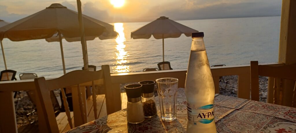 Ups, da ist es doch schon 19:00 Uhr und es wird Zeit, sich was zu Essen zu suchen. Wir beschließen den kurzen Weg Ortseinwärts. Wie es bei Ressorts häufig gedacht ist: Niemand geht hier zu Fuß weg. Das sagen uns die Fußwege eindeutig. Sie sind zugewachsen bis nicht vorhanden ;). Am Strand finden wir dann eine Taverne.