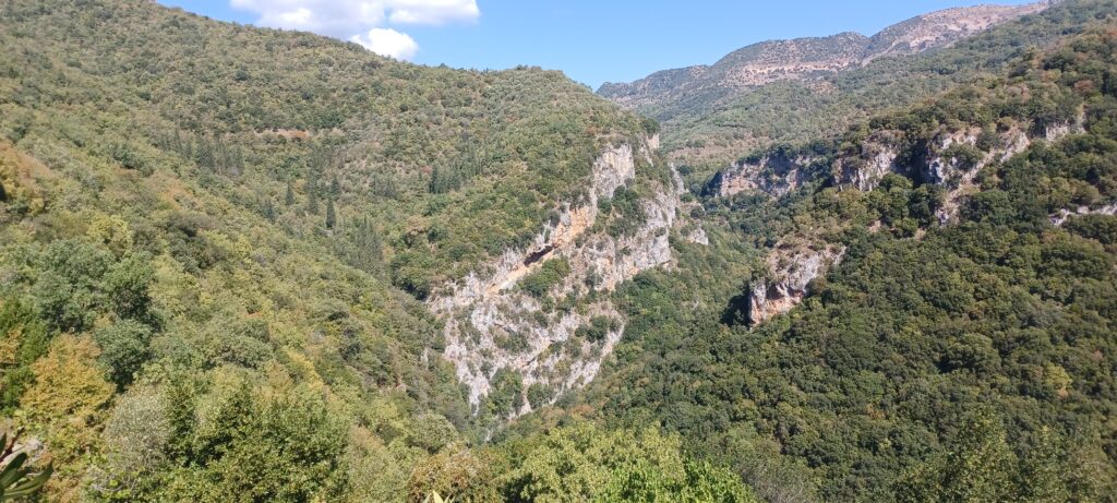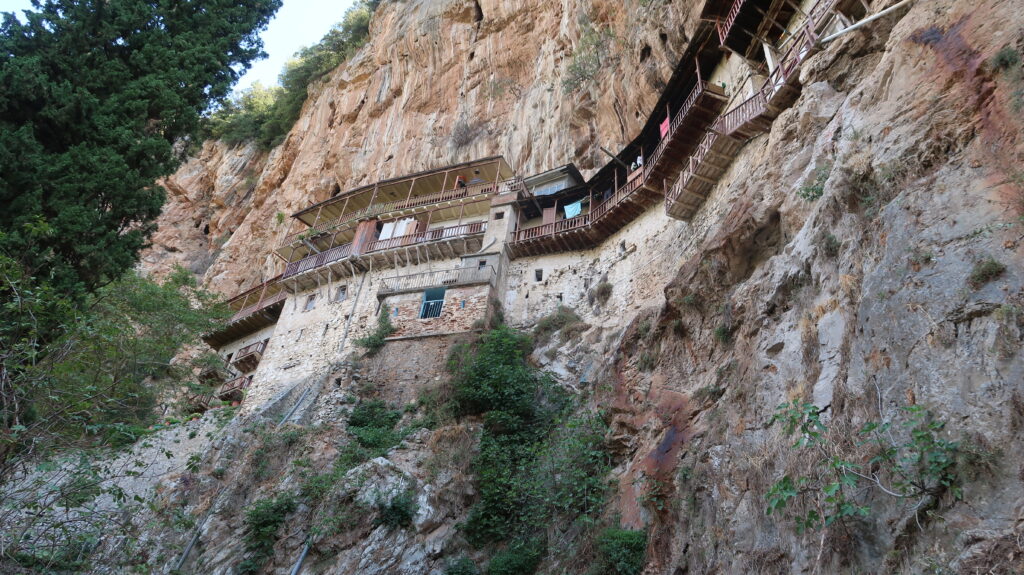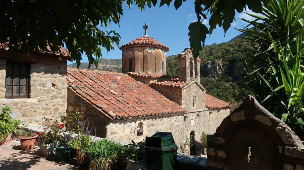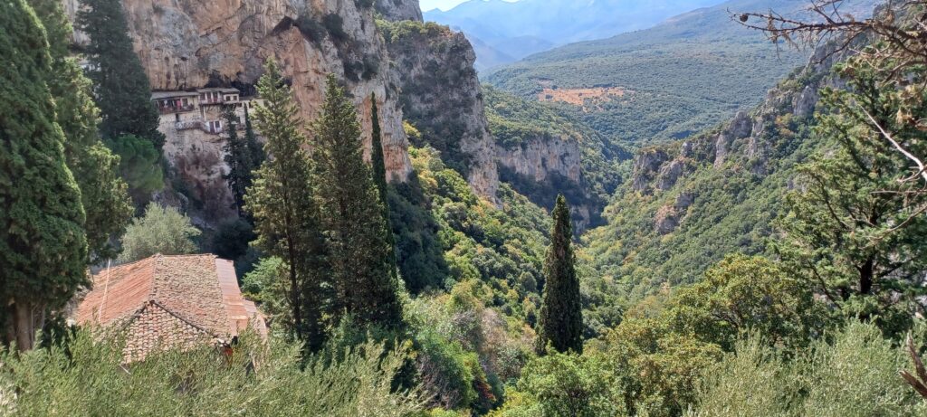 Unser Tagesziel ist Mikri Mantineia (Μίκρα Μαντινεία) Das ist ein kleiner Ort in der Nähe von Kalamata (Καλαμάτα) am Messianischen Golf. Auf dem Weg dahin machen wir allerdings noch einige Abstecher. Unseren ersten Halt machen wir am Kloster Filosofou (Μονή Φιλοσόφου) Dieses Kloster hängt am Hang der Lousios Schlucht
