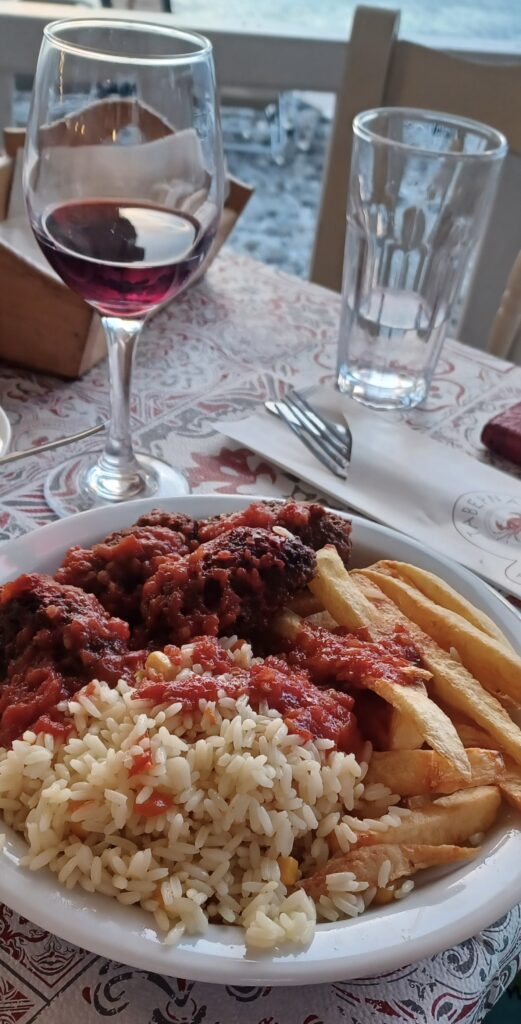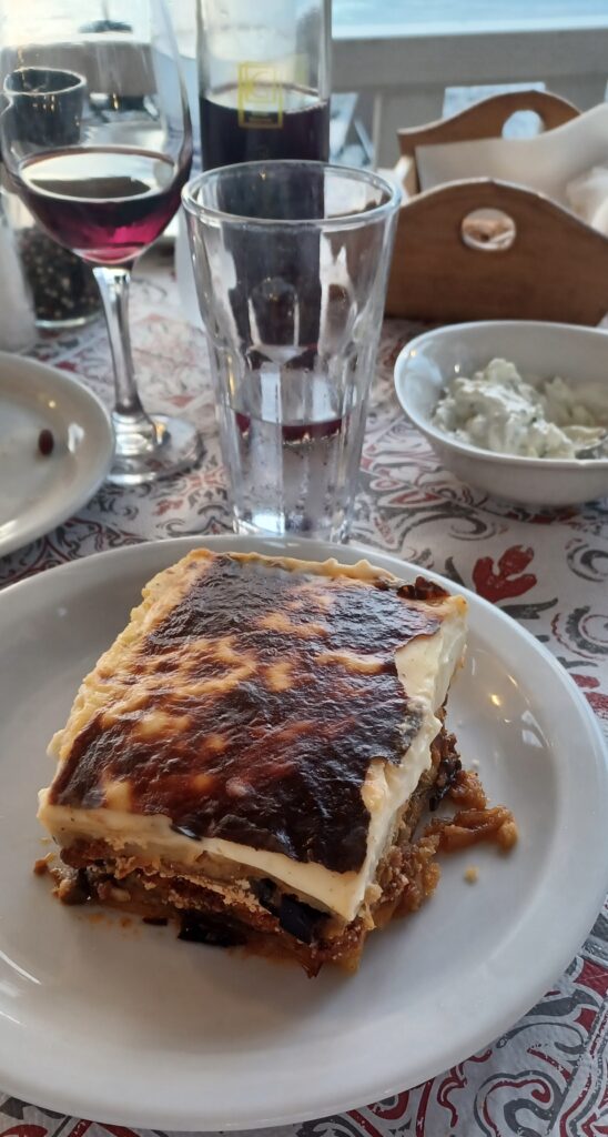 Heute gibt es Soutzoukaki und Mousakka. Beides wieder lecker, nur irgendwie werden die Portionen immer größer.