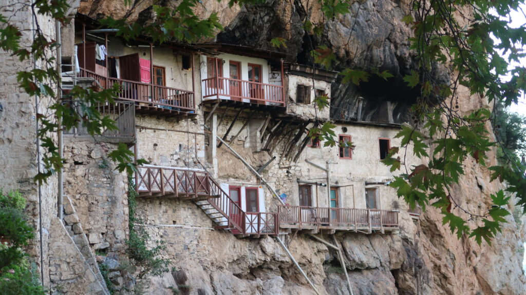 Hier sehen wir auch, dass von 13:00 bis 17:00 Uhr geschlossen ist. Jetzt ist es gerade 12:00 Uhr. Diese Information bringt uns aber mal dazu, beim nächsten Halt zu schauen, ob das dort auch zutrifft. Ja, auch hier ist von 13:00 Uhr bis 17:00 Uhr Mittagspause/Siesta/Zu. Oh, dann schauen wir mal, wie lange wir benötigen. Route 1 sagt 51 Minuten, Route 2 sagt 20 Minuten. Alles klar. Route 2. In dieser Gegend sind die Straßen sehr kurvenreich und eng. Das kennen wir schon von der Herfahrt. Jetzt kommt allerdings dazu, dass der Asphalt noch da ist, aber in einer sehr fragwürdigen Konsistenz. Auf die Frage was das für eine Straße ist, einigen wir uns darauf, dass es eine offizielle Straße ist und somit kein Offroad. Einige Löcher umfahren wir dann doch lieber im Schneckentempo. Trotz der unerwarteten Streckenqualität sind wir um 12:40 Uhr am Kloster des Heiligen Saint John the Forerunner (Ιερά Μονή Τιμίου Προδρόμου Στεμνίτσα) Naja, am Parkplatz. Was wir noch nicht wissen, aber sobald erleben, ist, dass es noch fast 15 Minuten bergab sind. Die 2 Minuten, die wir jetzt vor 13:00 Uhr im Klosterhof stehen, wollen wir (bzw. ich) dann doch nicht mehr in die Hallen. Zumal wir (obwohl gut vorbereitet) für dieses Kloster noch zu frivol angezogen sind. Grits knielanges Kleid mit Ärmeln ist noch zu kurz, mein kurzes Hemd und die Hosen aber auch. Dazu kommt, dass wir drinnen auch nicht fotografieren dürfen. Das ist uns dann doch zu viel klösterlicher Frieden. Also lassen wir die Innenbesichtigung und schauen uns das Kloster von außen an. Es ist schon beeindruckend, wie die Gebäude in die Felswand gebaut sind.