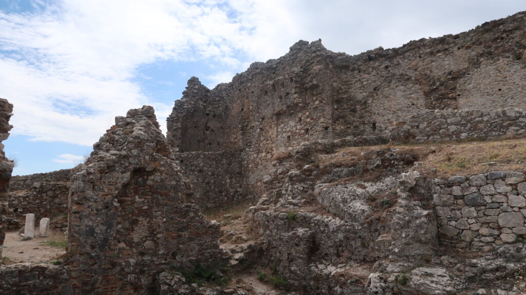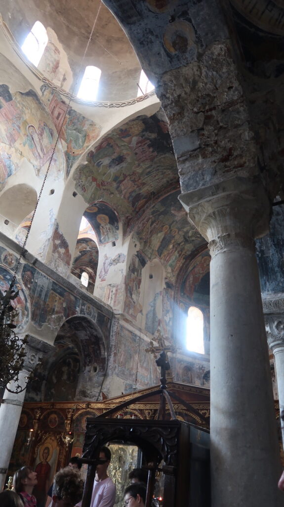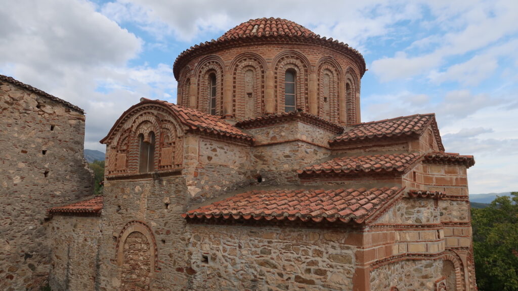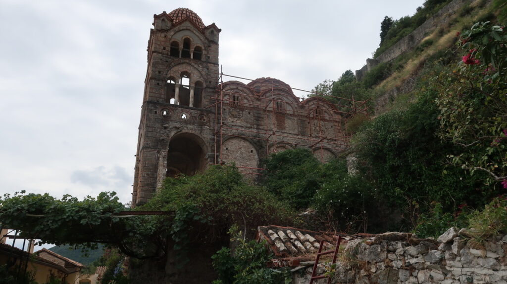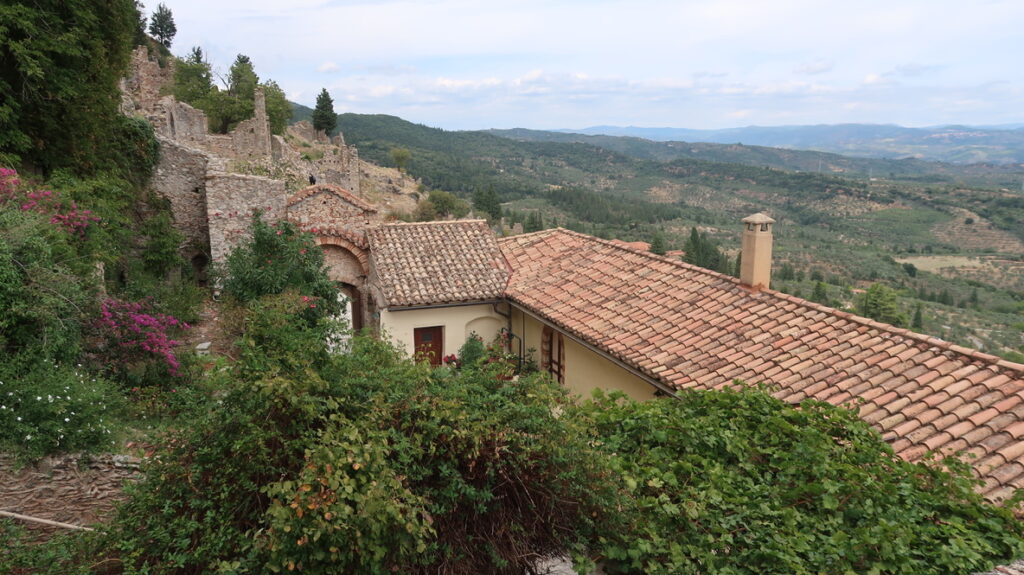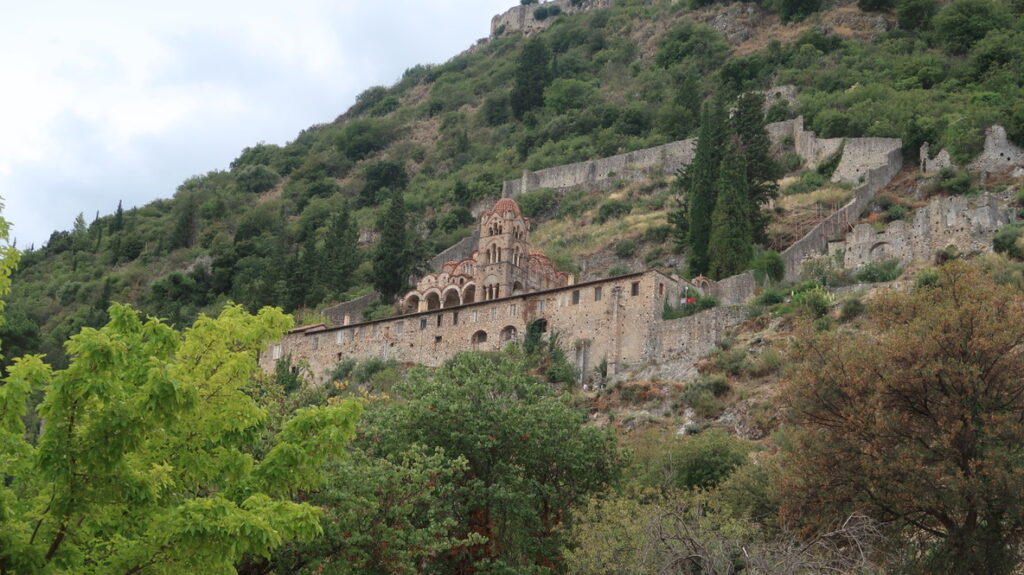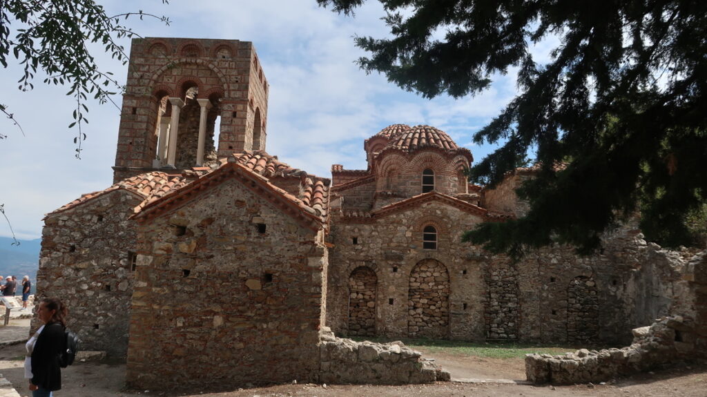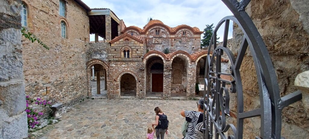 Auch wenn Mystras „nur“ noch im Bereich des Klosters Pantanassa bewohnt wird, bekommen wir den Eindruck, wie es ist, durch diese Stadt zu wandeln. Mit dem üblichen Blick auf unsere Kleidung, warten wir die Reaktion der Nonne im Kloster ab. Diese lächelt aber freundlich und grüßt uns. Alles klar, auch den Kleidungscheck haben wir überstanden. Als wir die Kirche betreten, treffen wir wieder unsere Jugendgruppe von der Burg ganz oben. Somit ist die Kirche voll und wir können hören, wie ein Vortrag mit dem Enthusiasmus eines Schülers gehalten wird. Auch die Verbesserungen der Lehrerin entgehen uns nicht. Sie hat auf jeden Fall Spaß ;). Als wir wieder draußen sind und weiter über das Gelände stromern, freuen wir uns, dass wir uns zwar noch gerne Vorträge anhören, aber nicht alles behalten müssen, um die nächste Klassenarbeit zu bestehen. 😀