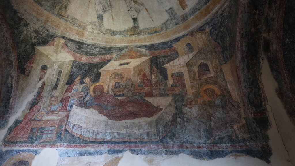 Hier kann man sehr schön die gesamte Ausbreitung von Mystras sehen. Als wir noch etwas verschnaufen, kommt uns mal wieder eine Jugendgruppe entgegen. Bei der Lehrerin sieht man sofort an der Ausstattung, dass sie Spaß hat. Ihre Schüler sehen da etwas anders aus 😀 Aber gut, wir hatten auf Ausflügen auch nicht immer so viel Spaß. Wobei es bei mir ja nur nach Niex und Prerow gereicht hat 😉 Wir beschließen den Abstieg. Auf dem Rückweg kommt uns schon wieder eine Gruppe Jugendlicher entgegen. Neben der Gruppe schallt uns ein Pennäler-röhrendes „Moin“ entgegen. Dieses erwidern wir natürlich mit einem Lächeln. Wieder beim oberen Eingang angekommen schlagen wir noch den Weg zu St. Sophia und St. Nikolaus ein. Hier sind wir die meiste Zeit hinter einer spanischen Reisegruppe hinterher, die das Ziel haben, alle Wörter dieser Welt bis zum Mittag zu verbrauchen. Die beiden Kirchen stammen aus dem 14. Jahrhundert. Es sind immer noch beeindruckende Wandmalereien zu erkennen. Von außen sehen sie sehr byzantinisch aus, was aufgrund der Geschichte sogar richtig ist ;).