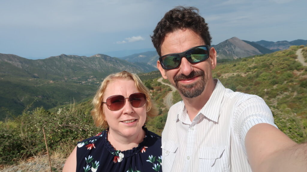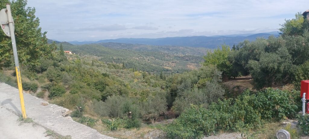 Die Straße von Kalamata führt uns sachte aber dauerhaft nach oben. Irgendwann haben dir Temperaturen nur noch 19 °C – wir sind mit 26°C gestartet. Die Uhr verrät uns, dass wir inzwischen 1100 Meter hoch sind. Die Aussicht ist einfach atemberaubend.