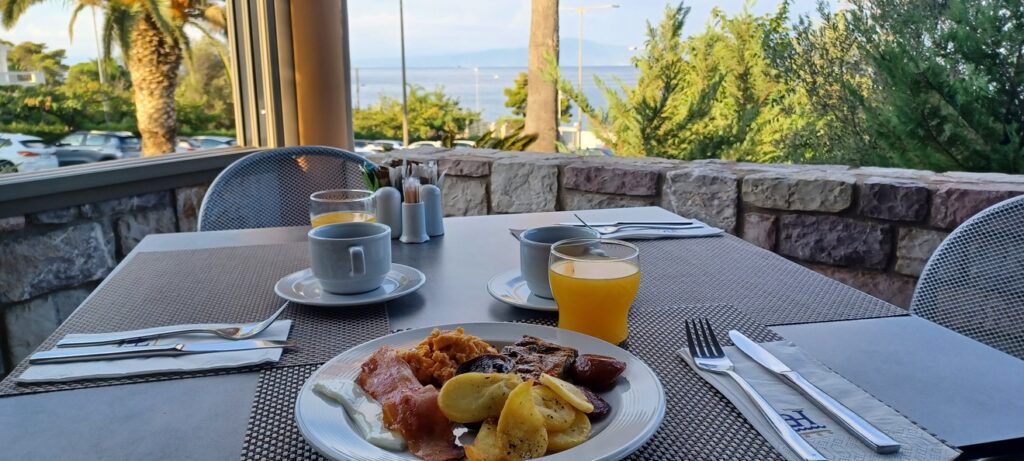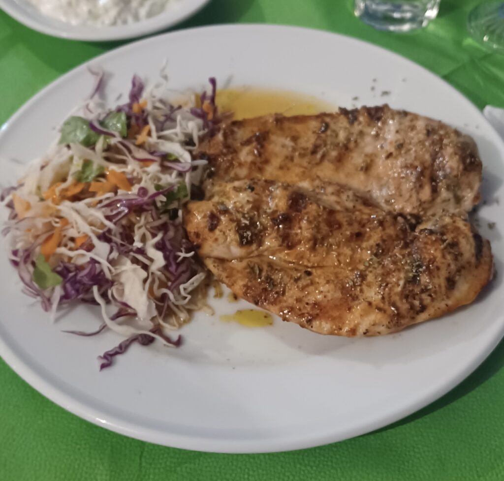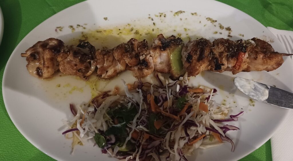Gegen 19:20 Uhr haben wir unseren aktuellen Heimatort wieder erreicht und suchen uns erstmal was zu Essen. Es gibt heute als Zusatzspeise Hühnchensouflaki und ein Hühnchensteak. Beides sehr lecker.