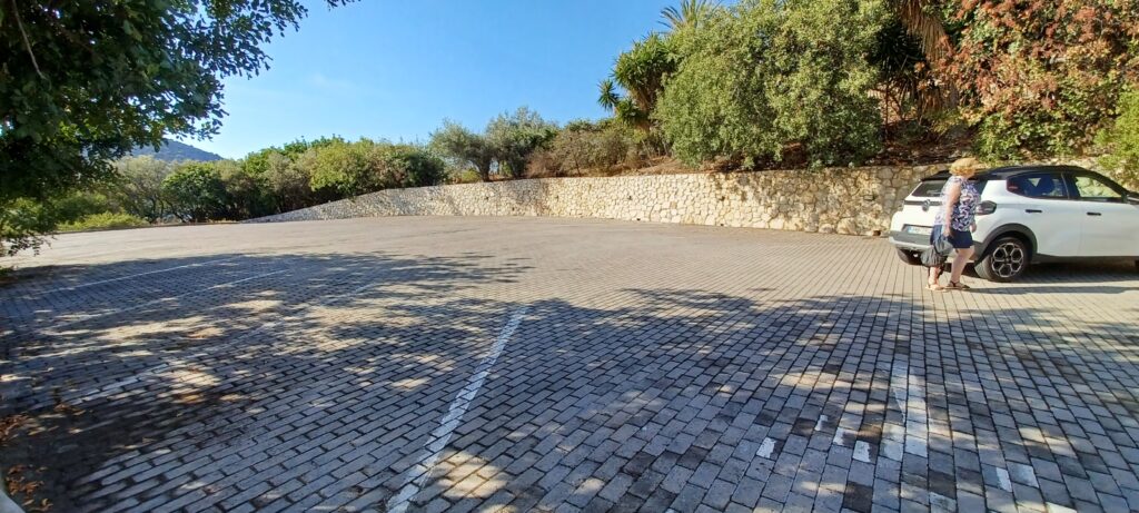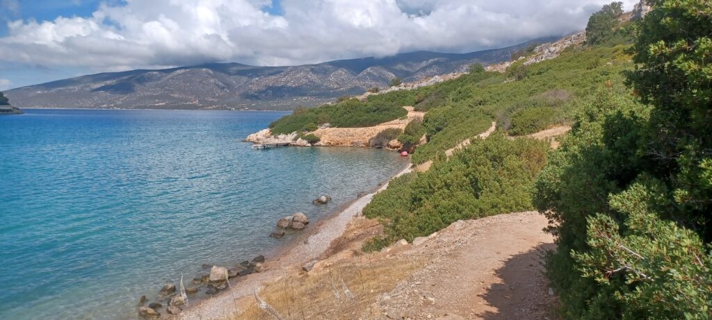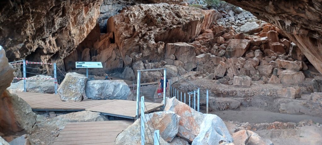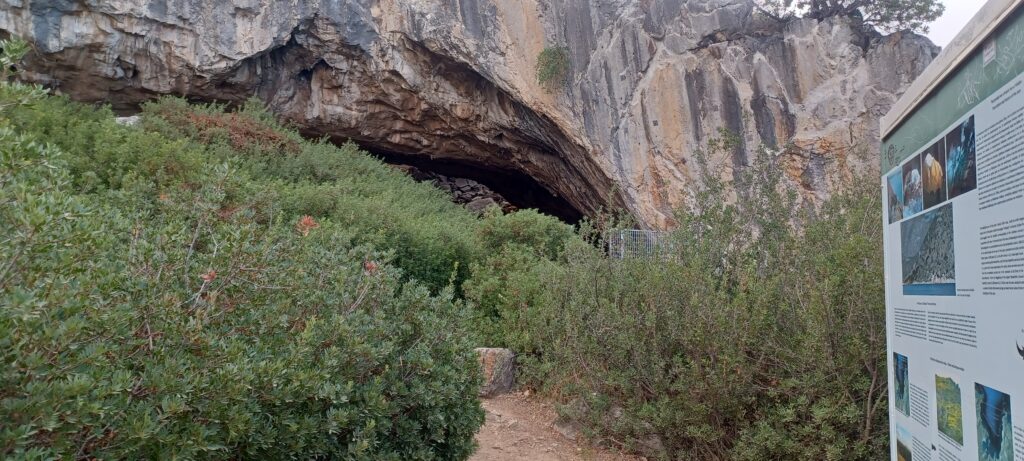 Die Straße dorthin sind wir gestern auch schon zum großen Teil gefahren. Sie ist immer noch so kurvig, aber immer noch schön gelegen. In der Nähe der Höhle, am Parkplatz, befindet sich ein kleiner aber feiner Strand. Das sieht doch schon gut aus. Aber erstmal die Bildung. Der Wanderweg zur Höhle geht über ein paar schöne Steine, die wir ohne Probleme meistern, immer am Wasser entlang. Die Höhle selber ist schon sehr beeindruckend. Hier sind die Jahreszahlen nochmal um ein paar Dimensionen älter, als die der Tempel. Auch so ist wieder alles schön aufgearbeitet und für uns gut verständlich. Der Blick auf das Handy verrät mir dann, dass es vor der Höhle noch einen Cache gibt. Diesem wird natürlich gleich noch ein erfolgreicher Besuch abgestattet (wenigstens ein paar in Griechenland 😉 )