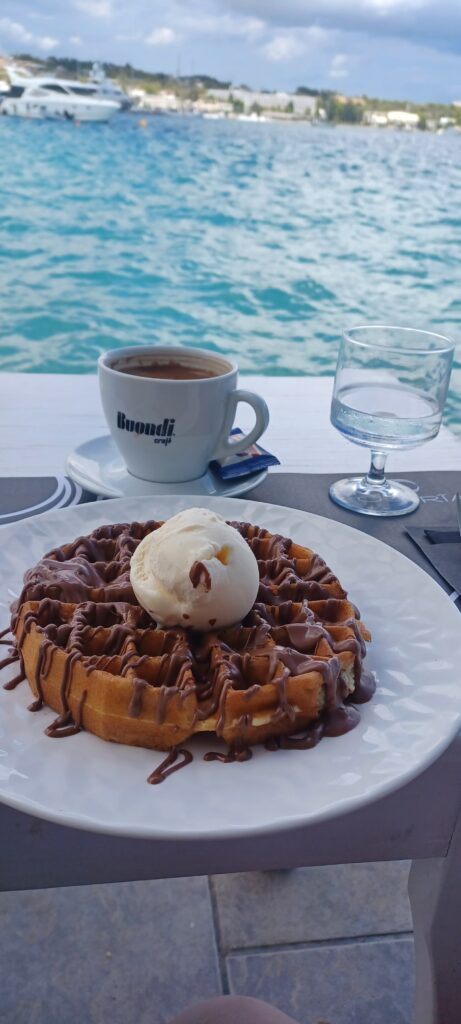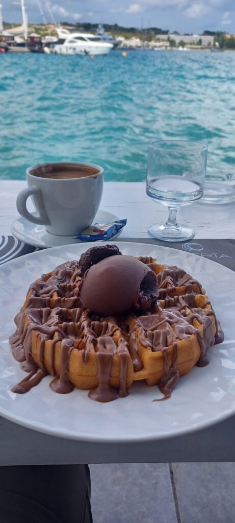 Im Ostria Kaffee werden wir fündig. Zu der Eiskugel gesellt sich aber noch eine Waffel. Mmmmhhhh. Die ist ziemlich lecker. Völlig satt und zufrieden sitzen wir noch ein Weilchen am Wasser und schauen, wie große Yachten hier rückwärts einparken.