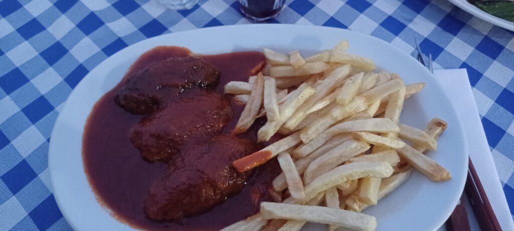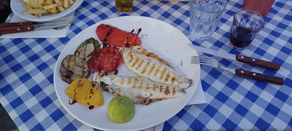 Gegen 18:00 Uhr sind wir wieder in Tolo angekommen. Die Frage nach dem Abendessen steht wieder auf dem Plan. Eigentlich haben wir nur 2 Lösungen. Entweder wir schauen uns die anderen Tavernen nochmal an und landen dann bei Romvi oder wir sparen uns das Anschauen und gehen direkt dahin. Unter dem Deckmantel von Lösung 1 wird es Lösung 2 😀 . Unser Tisch ist auch heute frei und unsere Bestellung geht für das Zubehör schon fast alleine.