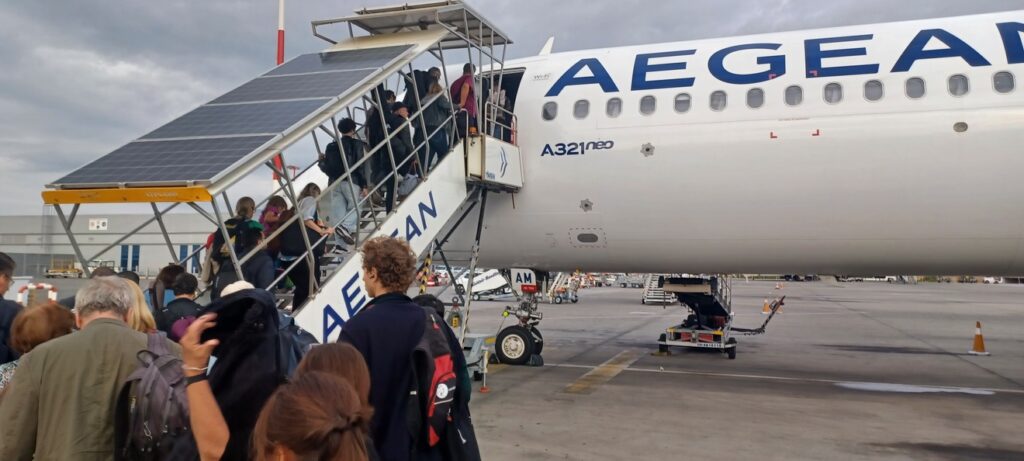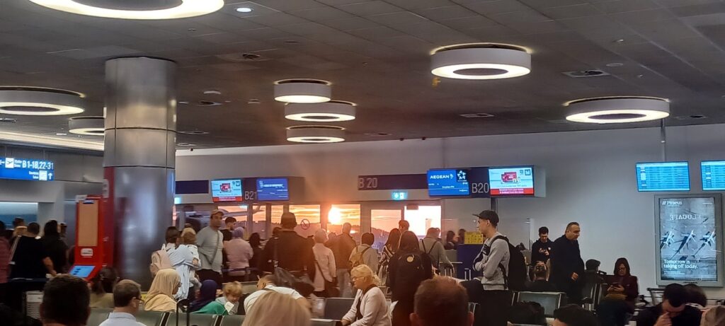 Der Check-Out ist schnell erledigt und unser Taxi wartet auch schon auf uns. Um diese Uhrzeit gibt es sogar Parkplätze vor dem Hotel. Die Fahrt durch Athen zum Flughafen verläuft reibungslos. Es gibt nur zu viele rote Ampeln. Diese verbinden sich erst bei einer Durchschnittsgeschwindigkeit von 80 km/h zu einer grünen Welle. Den Flughafen von Athen haben wir ohne Probleme erreicht. Ui, hier sind ja schon viele Menschen unterwegs. Unsere Kofferabgabeschalter (die Boarding-Pässe haben wir uns schon gestern geholt) sind auch schon besetzt. Naja, einer von fünf ist besetzt. Also stellen wir uns an und stellen mit Freude fest, dass wir keinen Augenblick zu früh hier stehen. Hinter uns wächst die Schlange in unglaublicher Geschwindigkeit. Die Dame am Schalter tut, was sie kann, aber diskutierende Kinderwagenbesitzer und Leute die mit 3 statt 1 Koffer unterwegs sind, dauern halt ein Weilchen. Nachdem wir unsere Koffer los sind (ja, die Anlage funktioniert, unsere Koffer haben gedruckte Etiketten und wir können unsere elektronischen Boardingpässe nutzen), geht es zur Sicherheitskontrolle. Hier ist es auch gerammelt voll, aber mit griechischer Kontinunierlichkeit sind wir erstaunlich schnell durch die Kontrollen. Im Sicherheitsbereich stellen wir fest, dass nur eine Stunde vergangen ist, seit wir den Flughafen betreten haben. Das war schnell.
