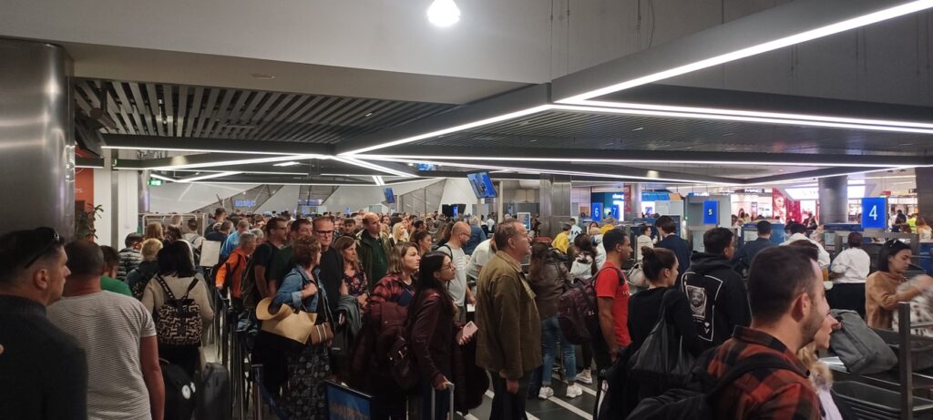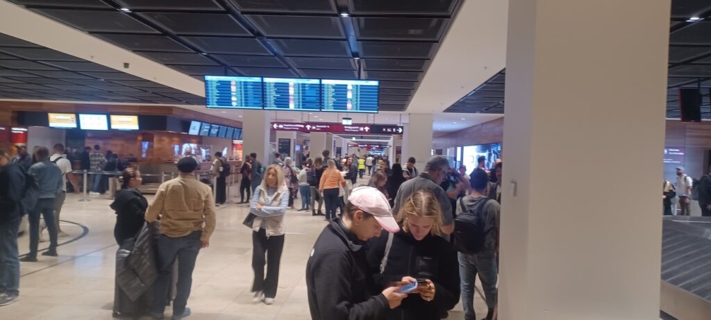 Pünktlich um 10:46 Uhr legt unser Flugzeug an. Wir sind da. Auf zu den Gepäckbändern. Im Bereich der Gepäckbänder erklärt sich endlich die Frage von letzter Woche, wo die Leute alle sind: Hier.